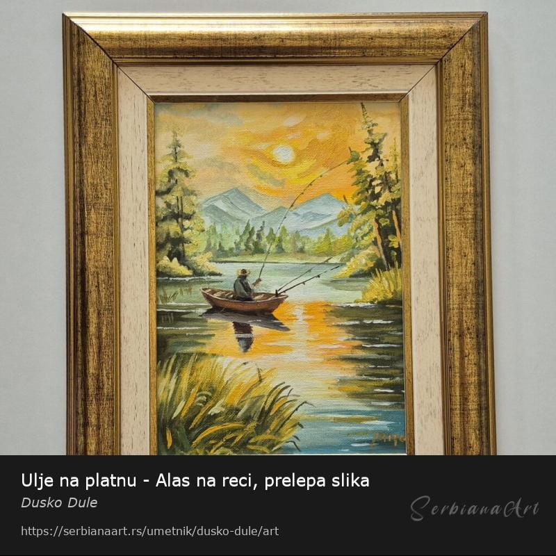 Ulje na platnu Alas na reci, prelepo umetnicko delo, slika je uramljena u jako lep ram, dimenzije slike sa ramom 37 x 30. Privatna kolekcija.