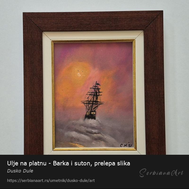 Ulje na platnu Barka i suton, prelepo umetnicko delo. Slika je uramljena u jako lep ram, dimenzije slike sa ramom 37 x 31. Privatna kolekcija.
