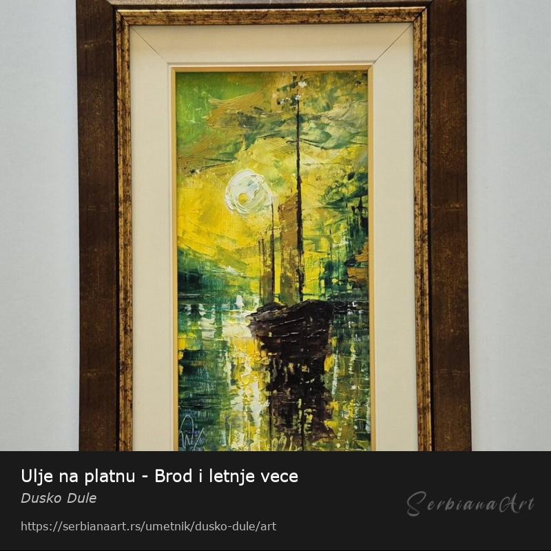 Ulje na platnu Brod i letnje vece, prelepo umetnicko delo. Slika je uramljena u jako lep ram, dimenzije slike sa ramom 48 x 32. Privatna kolekcija.