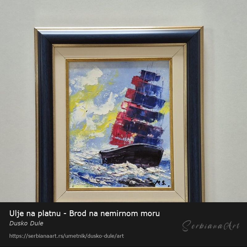 Ulje na platnu Brod na nemirnom moru, prelepo umetnicko delo. Slika je uramljena u jako lep ram, dimenzije slike sa ramom 37 x 32. Privatna kolekcija.