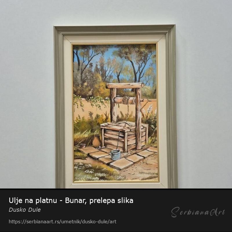 Ulje na platnu Bunar, prelepo umetnicko delo. Slika je uramljena u jako lep ram, dimenzije slike sa ramom 50 x 35. Privatna kolekcija.