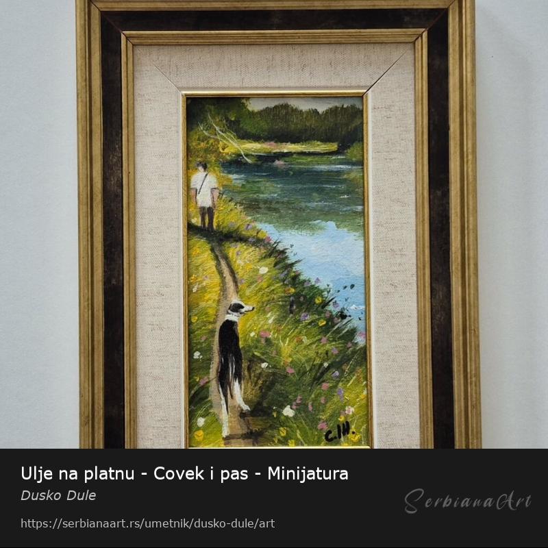Ulje na platnu Covek i pas, prelepo umetnicko delo. Minijatura. Slika je uramljena u jako lep ram, dimenzije slike sa ramom 34 x 24. Privatna kolekcija.