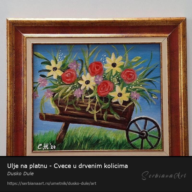 Ulje na platnu Cvece u drvenim kolicima, prelepo umetnicko delo. Slika je uramljena u jako lep ram, dimenzije slike sa ramom 41 x 36. Privatna kolekcija.