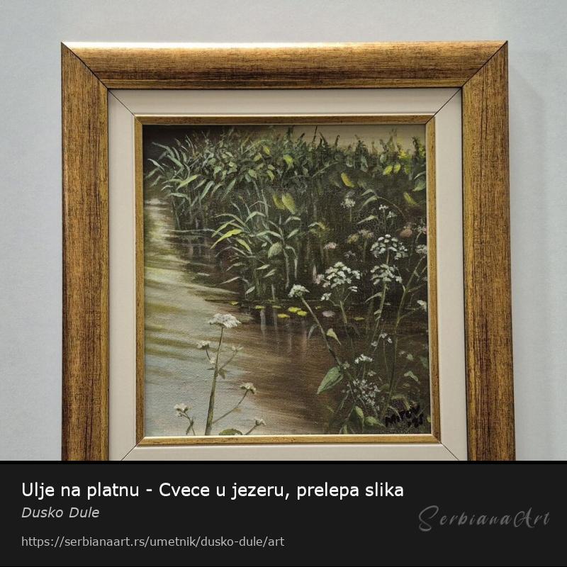Ulje na platnu Cvece u jezeru, prelepo umetnicko delo. Slika je uramljena u jako lep ram, dimenzije slike sa ramom 34 x 32. Privatna kolekcija.