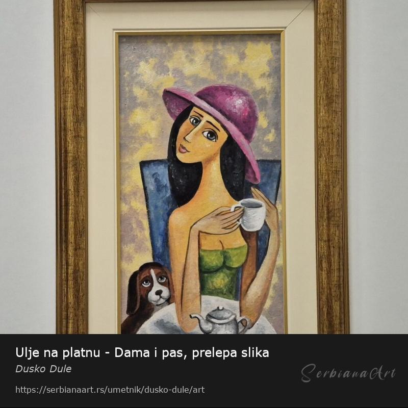 Ulje na platnu Dama i pas, prelepo umetnicko delo. Slika je uramljena u jako lep ram, dimenzije slike sa ramom 55 x 35. Privatna kolekcija.