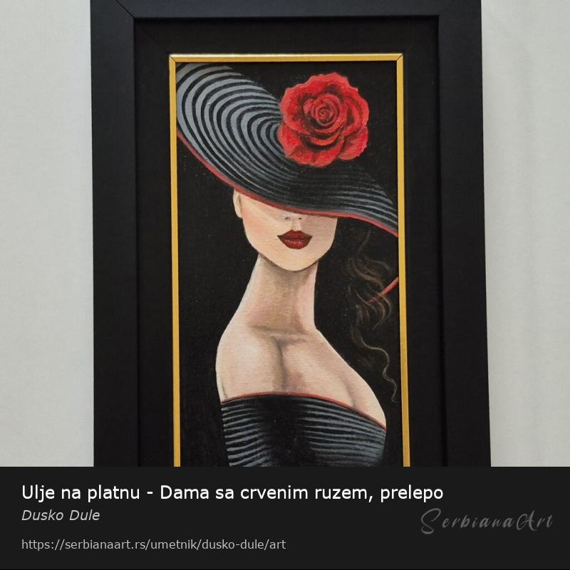 Ulje na platnu Dama sa crvenim ruzem, prelepo umetnicko delo. Slika je uramljena u jako lep ram, dimenzije slike sa ramom 52 x 33. Privatna kolekcija.