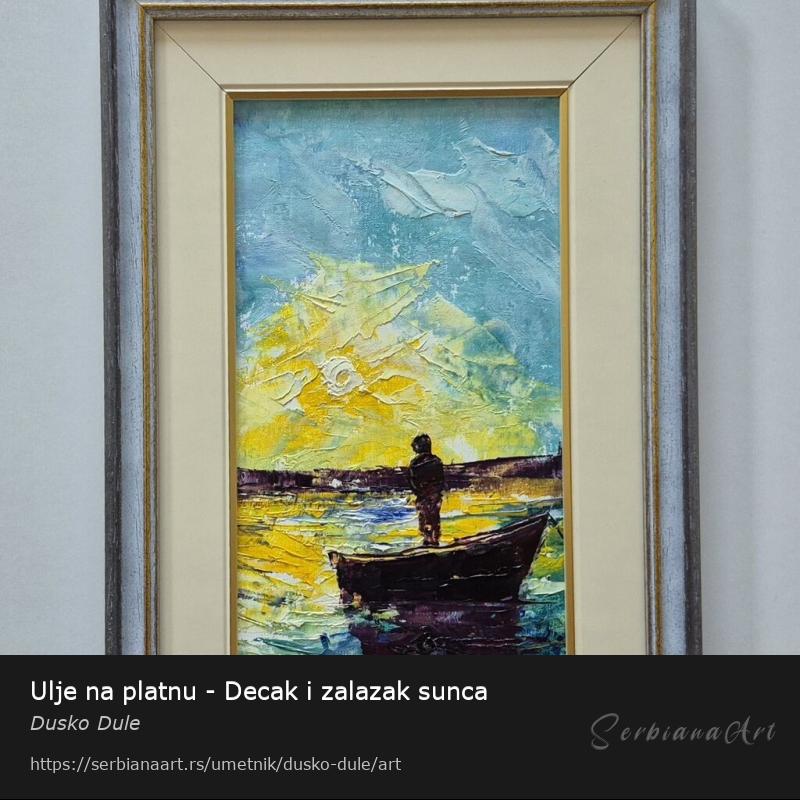 Ulje na platnu Decak i zalazak sunca, prelepo umetnicko delo. Slika je uramljena u jako lep ram, dimenzije slike sa ramom 41 x 29. Privatna kolekcija.