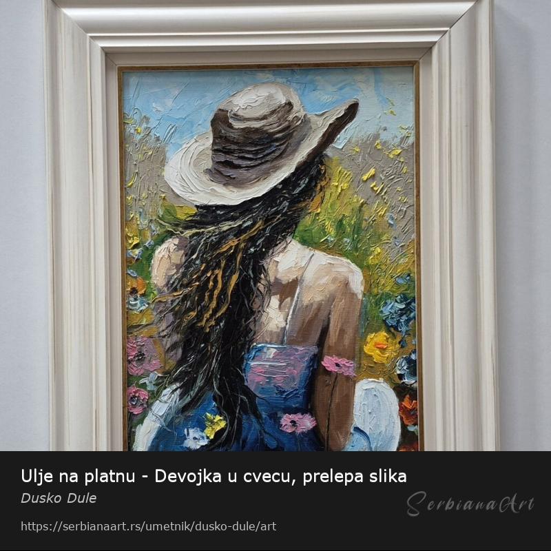 Ulje na platnu Devojka u cvecu, prelepo umetnicko delo. Slika je uramljena u jako lep ram, dimenzije slike sa ramom 59 x 45. Privatna kolekcija.