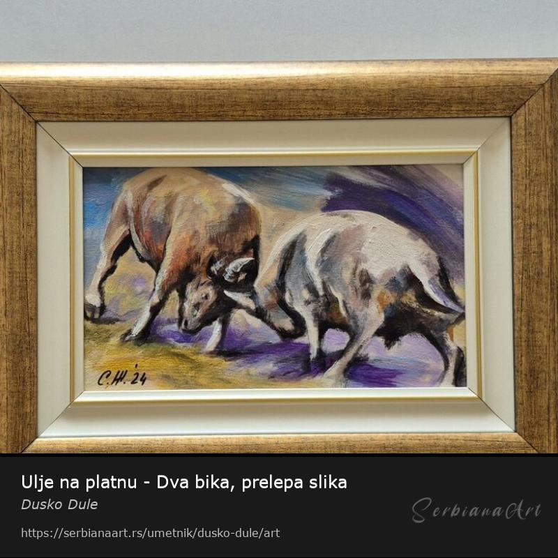 Ulje na platnu Dva bika, prelepo umetnicko delo. Slika je uramljena u jako lep ram, dimenzije slike sa ramom 41 x 30. Privatna kolekcija.