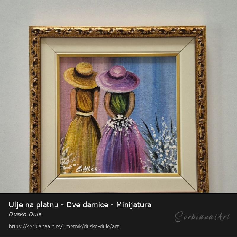 Ulje na platnu Dve damice, prelepo umetnicko delo. Minijatura. Slika je uramljena u jako lep ram, dimenzije slike sa ramom 25 x 25. Privatna kolekcija.