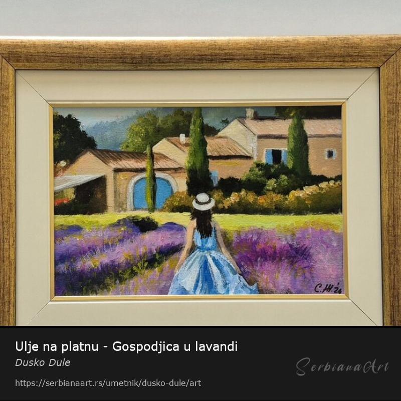 Ulje na platnu Gospodjica u lavandi, prelepo umetnicko delo. Slika je uramljena u jako lep ram, dimenzije slike sa ramom 43 x 33. Privatna kolekcija.