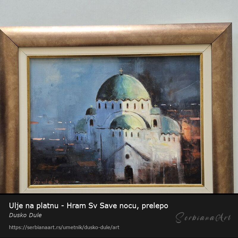 Ulje na platnu Hram Sv. Save nocu, prelepo umetnicko delo. Slika je uramljena u jako lep ram, dimenzije slike sa ramom 55 x 45. Privatna kolekcija.