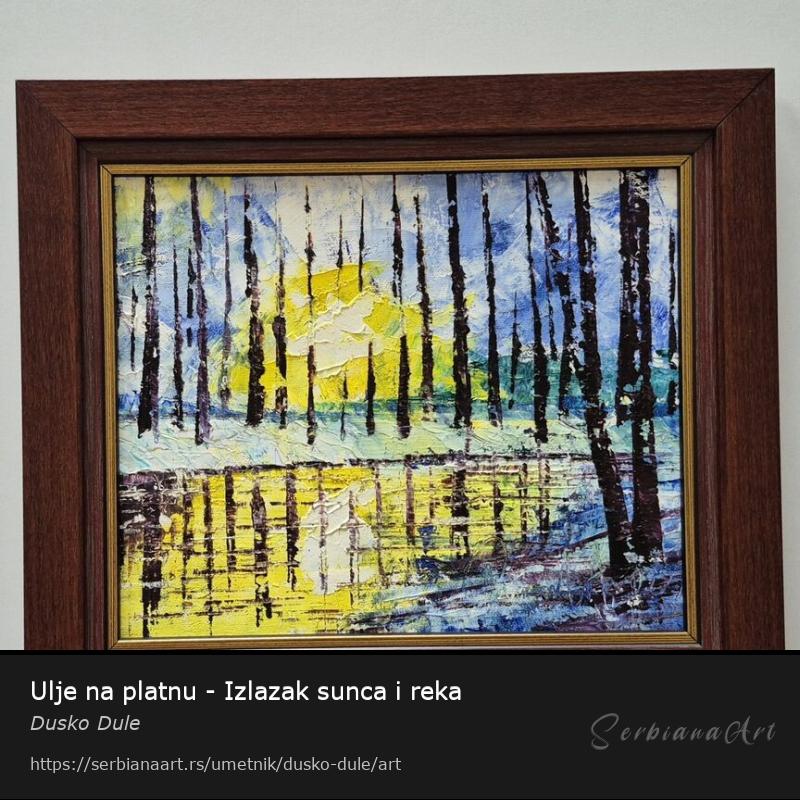 Ulje na platnu Izlazak sunca i reka, prelepo umetnicko delo. Slika je uramljena u jako lep ram, dimenzije slike sa ramom 39 x 34. Privatna kolekcija.