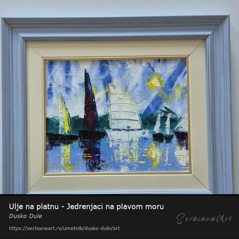 Ulje na platnu Jedrenjaci na plavom moru, prelepo umetnicko delo. Slika je uramljena u jako lep ram, dimenzije slike sa ramom 46 x 40. Privatna kolekcija.