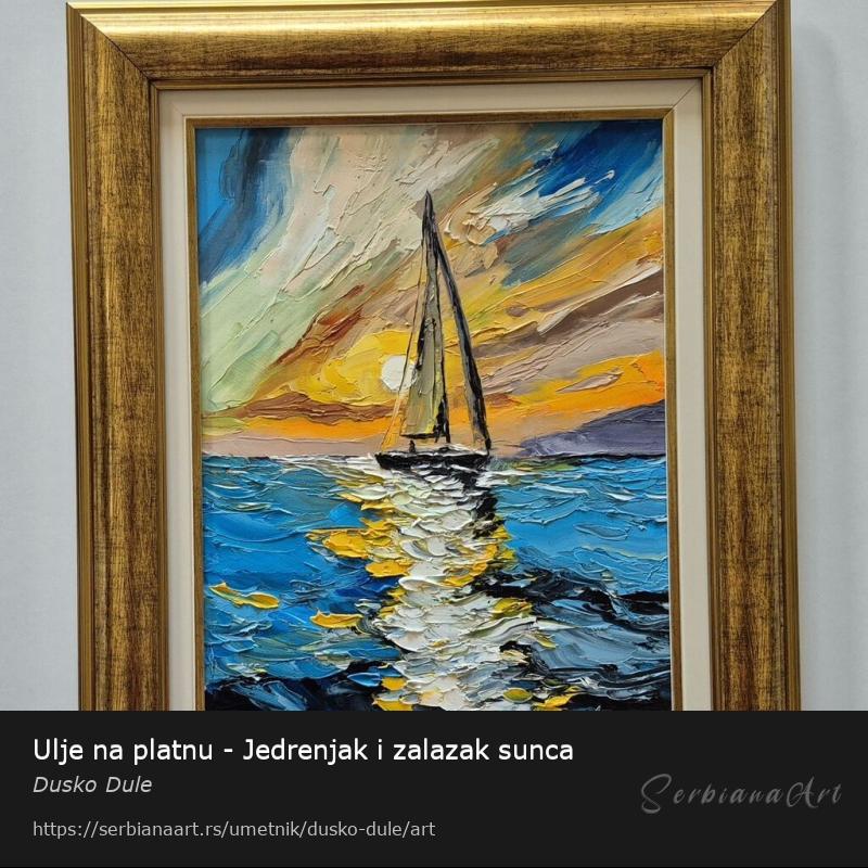 Ulje na platnu Jedrenjak i zalazak sunca, prelepo umetnicko delo. Slika je uramljena u jako lep ram, dimenzije slike sa ramom 56 x 46. Privatna kolekcija.