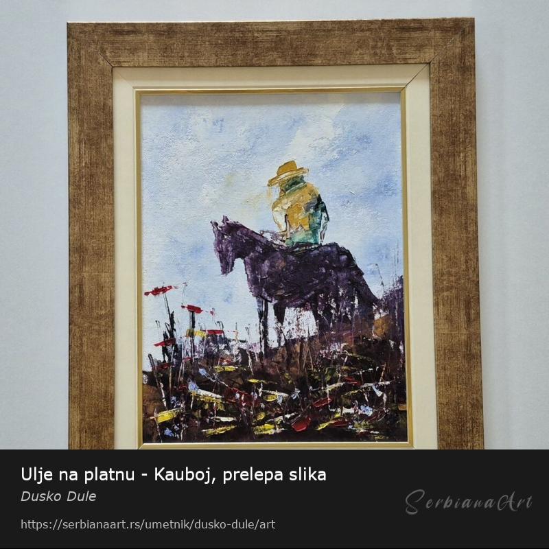 Ulje na platnu Kauboj, prelepo umetnicko delo. Slika je uramljena u jako lep ram, dimenzije slike sa ramom 45 x 37. Privatna kolekcija.