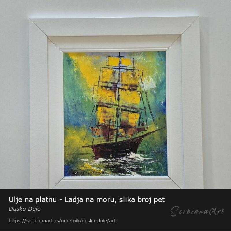 Ulje na platnu Ladja na moru, slika broj pet. Prelepo umetnicko delo. Slika je uramljena u jako lep ram, dimenzije slike sa ramom 45 x 40. Privatna kolekcija.