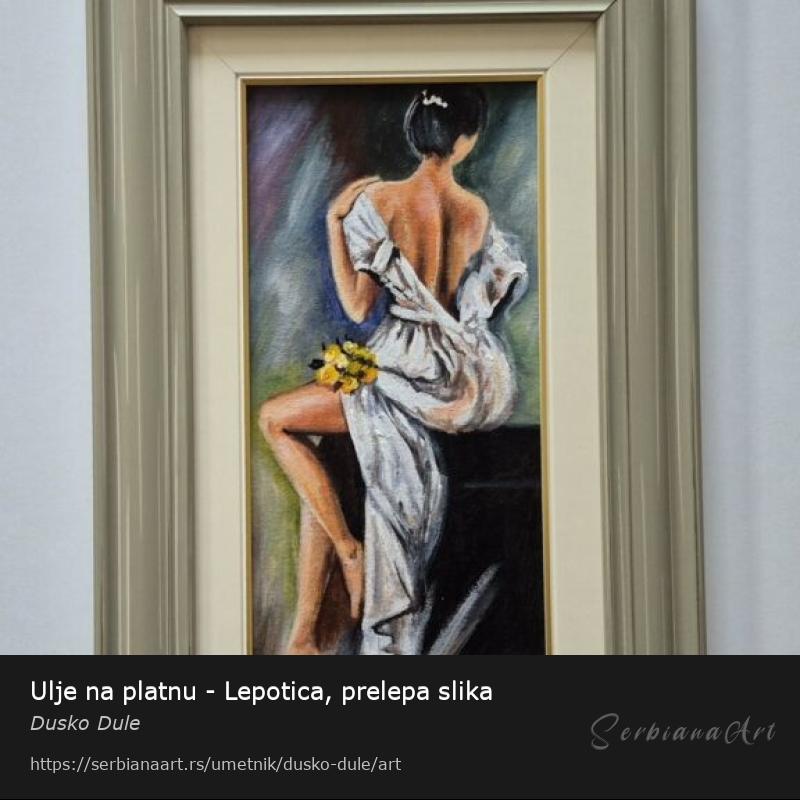Ulje na platnu Lepotica, prelepo umetnicko delo. Slika je uramljena u jako lep ram, dimenzije slike sa ramom 58 x 38. Privatna kolekcija.