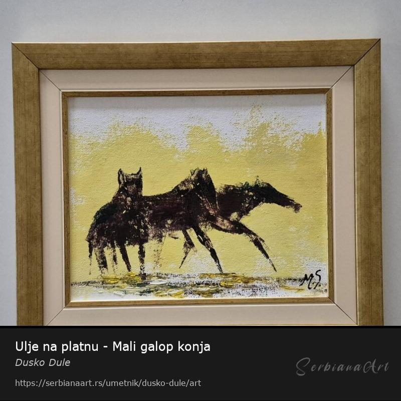 Ulje na platnu Mali galop konja, prelepo umetnicko delo. Slika je uramljena u jako lep ram, dimenzije slike sa ramom 34 x 29. Privatna kolekcija.