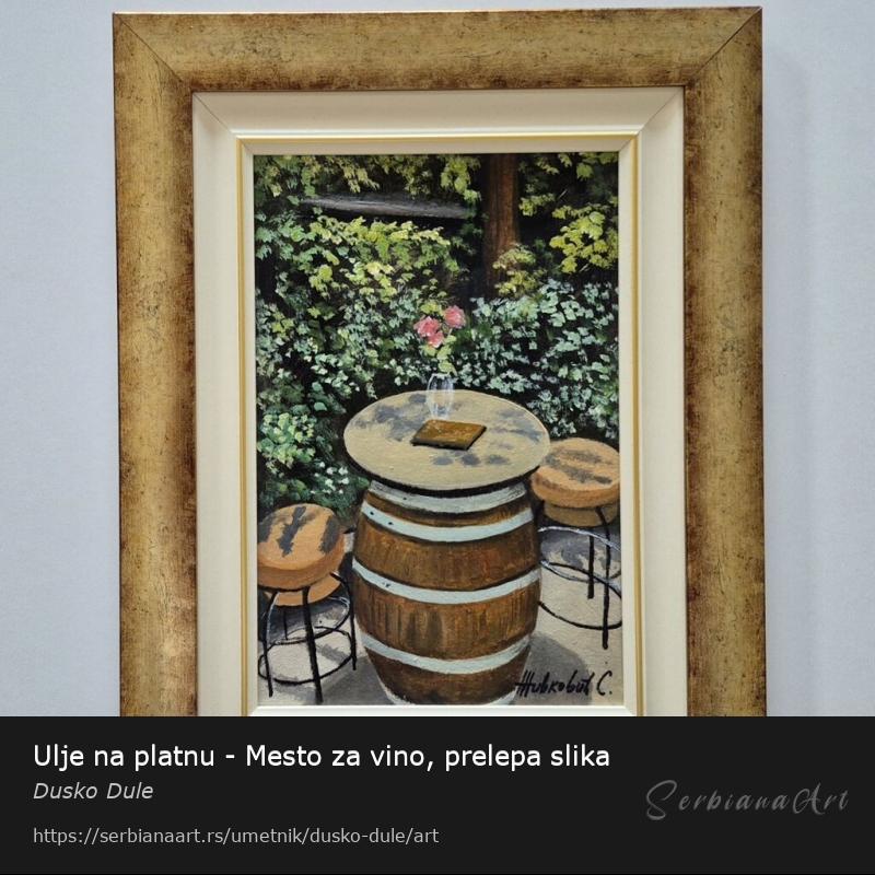 Ulje na platnu Mesto za vino, prelepo umetnicko delo. Slika je uramljena u jako lep ram, dimenzije slike sa ramom 43 x 33. Privatna kolekcija.