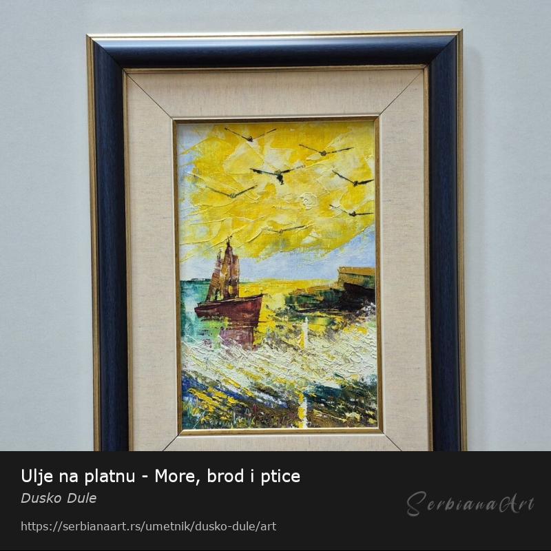 Ulje na platnu More, brod i ptice. Prelepo umetnicko delo. Slika je uramljena u jako lep ram, dimenzije slike sa ramom 46 x 36. Privatna kolekcija.