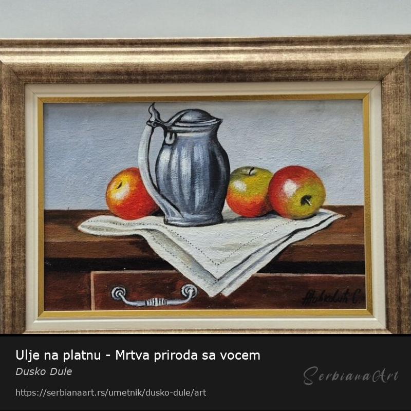Ulje na platnu Mrtva priroda sa vocem, prelepo umetnicko delo. Slika je uramljena u jako lep ram, dimenzije slike sa ramom 41 x 31. Privatna kolekcija.