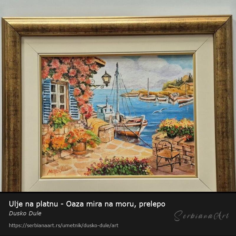 Ulje na platnu Oaza mira na moru, prelepo umetnicko delo. Slika je uramljena u jako lep ram, dimenzije slike sa ramom 45 x 38. Privatna kolekcija.