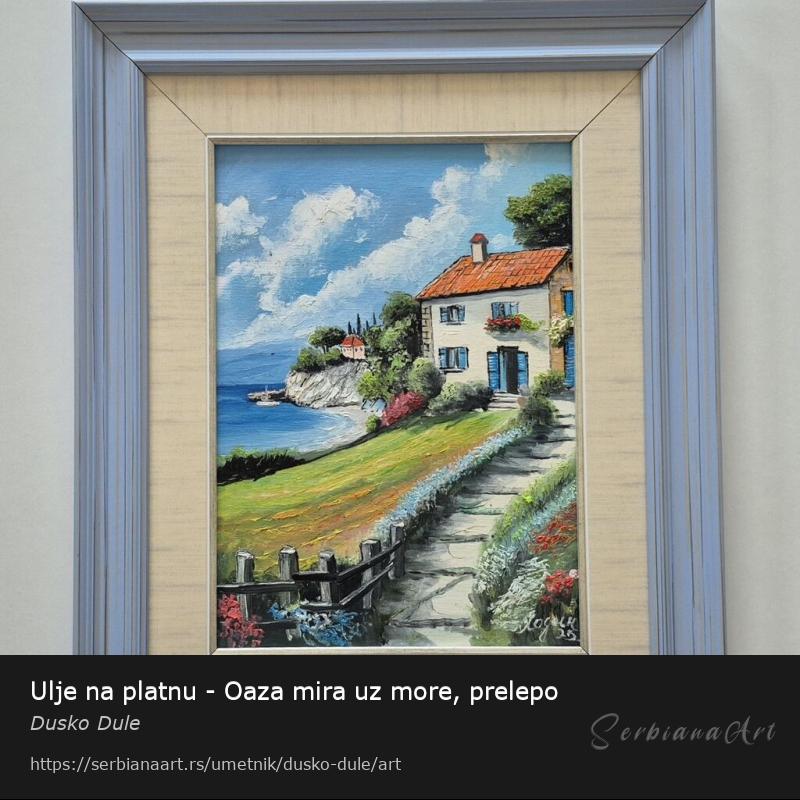 Ulje na platnu Oaza mira uz more, prelepo umetnicko delo. Slika je uramljena u jako lep ram, dimenzije slike sa ramom 53 x 43. Privatna kolekcija.