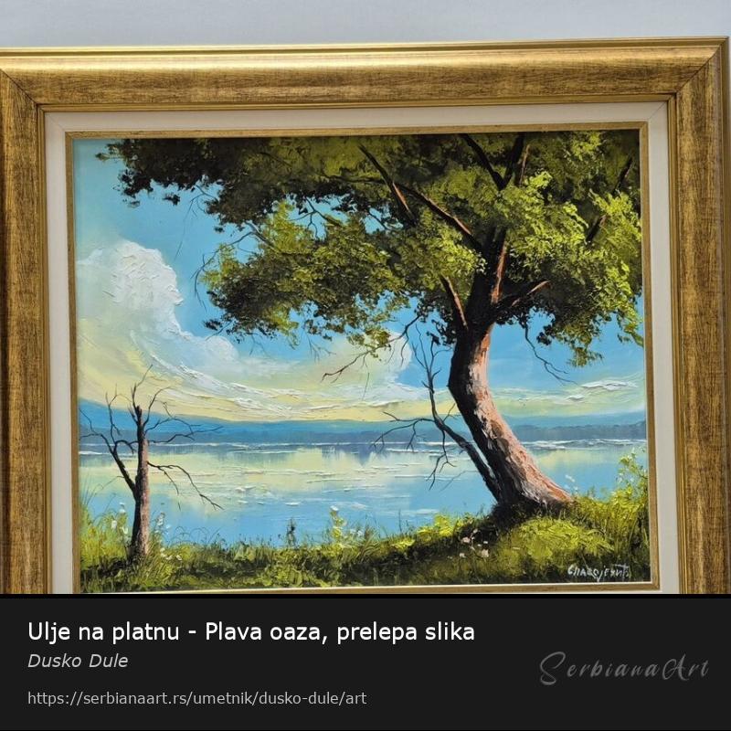 Ulje na platnu Plava oaza, prelepo umetnicko delo. Slika je uramljena u jako lep ram, dimenzije slike sa ramom 67 x 57. Privatna kolekcija.