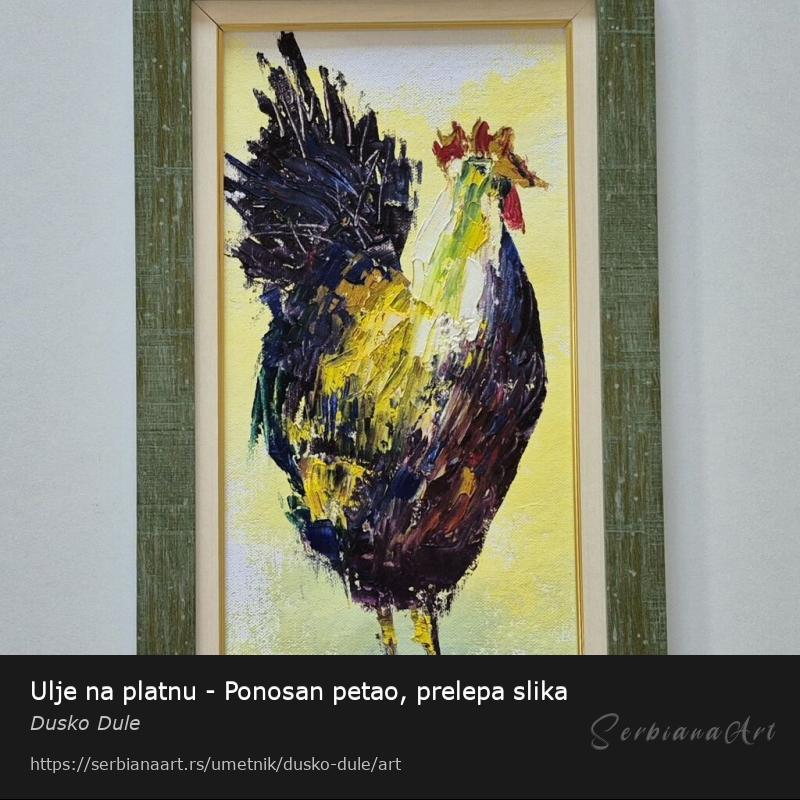 Ulje na platnu Ponosan petao, prelepo umetnicko delo. Slika je uramljena u jako lep ram, dimenzije slike sa ramom 47 x 27. Privatna kolekcija.