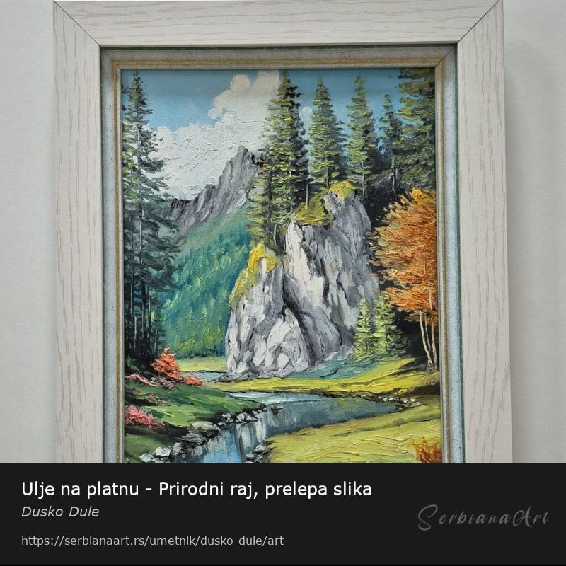 Ulje na platnu Prirodni raj, prelepo umetnicko delo. Slika je uramljena u jako lep ram, dimenzije slike sa ramom 51 x 41. Privatna kolekcija.