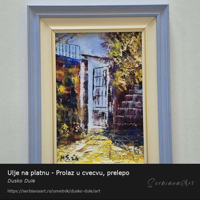 Ulje na platnu Prolaz u cvecu, prelepo umetnicko delo. Slika je uramljena u jako lep ram, dimenzije slike sa ramom 41 x 31. Privatna kolekcija.