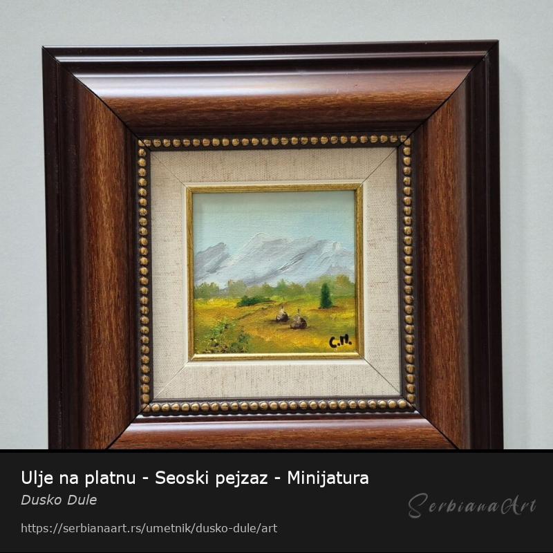 Ulje na platnu Seoski pejzaz, prelepo umetnicko delo. Minijatura. Slika je uramljena u jako lep ram, dimenzije slike sa ramom 26 x 26. Privatna kolekcija.