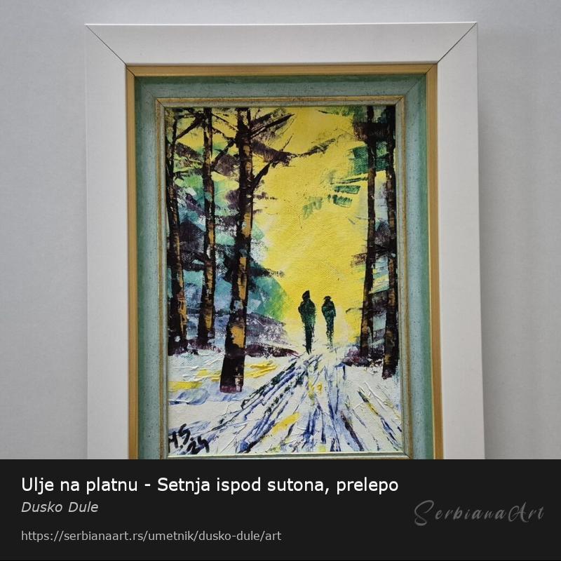 Ulje na platnu Setnja ispod sutona, prelepo umetnicko delo. Slika je uramljena u jako lep ram, dimenzije slike sa ramom 40 x 30. Privatna kolekcija.