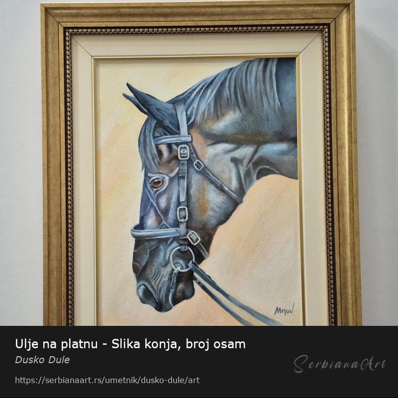 Ulje na platnu Slika konja, broj osam. Prelepo umetnicko delo. Slika je uramljena u jako lep, luksuzan ram. Dimenzije slike sa ramom 55 x 45. Privatna kolekcija.