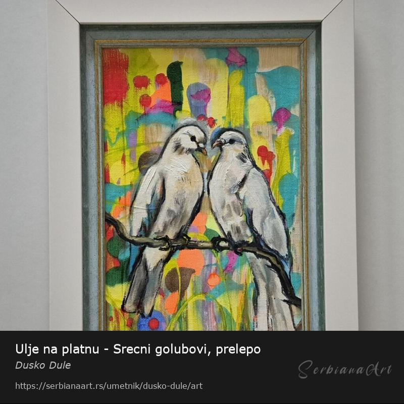 Ulje na platnu Srecni golubovi, prelepo umetnicko delo. Slika je uramljena u jako lep ram, dimenzije slike sa ramom 39 x 29. Privatna kolekcija.
