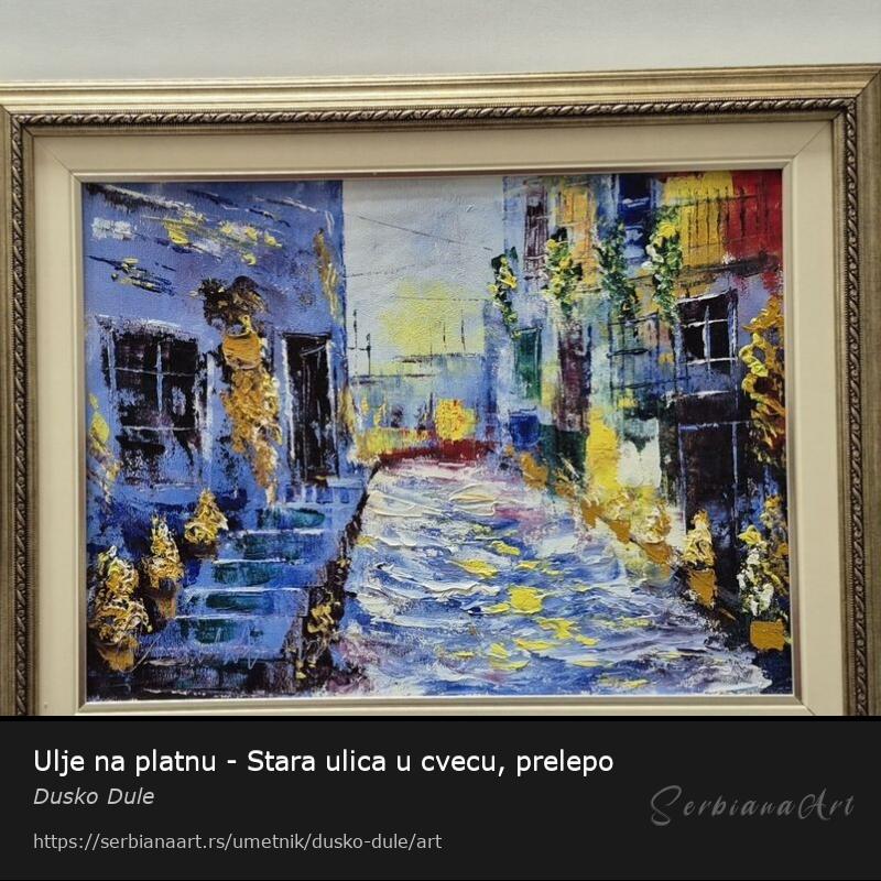 Ulje na platnu Stara ulica u cvecu, prelepo umetnicko delo. Slika je uramljena u jako lep ram, dimenzije slike sa ramom 52 x 42. Privatna kolekcija.