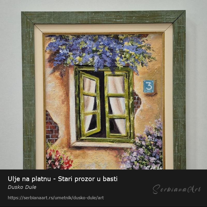 Ulje na platnu Stari prozor u basti, prelepo umetnicko delo. Slika je uramljena u jako lep ram, dimenzije slike sa ramom 44 x 40. Privatna kolekcija.