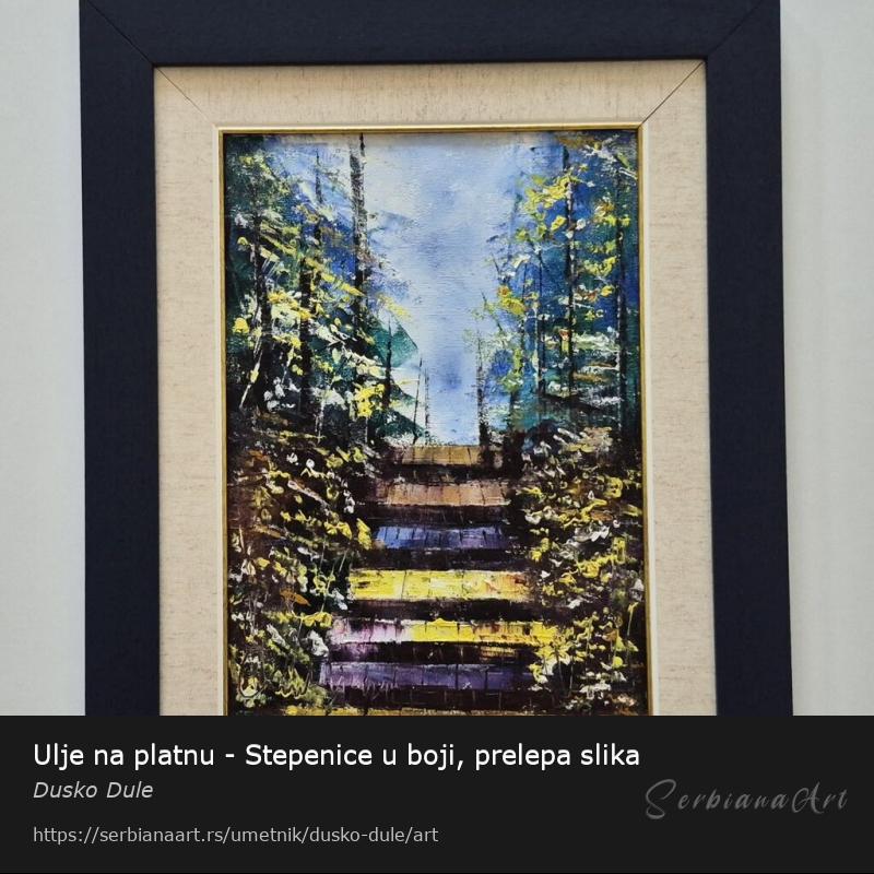 Ulje na platnu Stepenice u boji, prelepo umetnicko delo. Slika je uramljena u jako lep ram, dimenzije slike sa ramom 50 x 40. Privatna kolekcija.