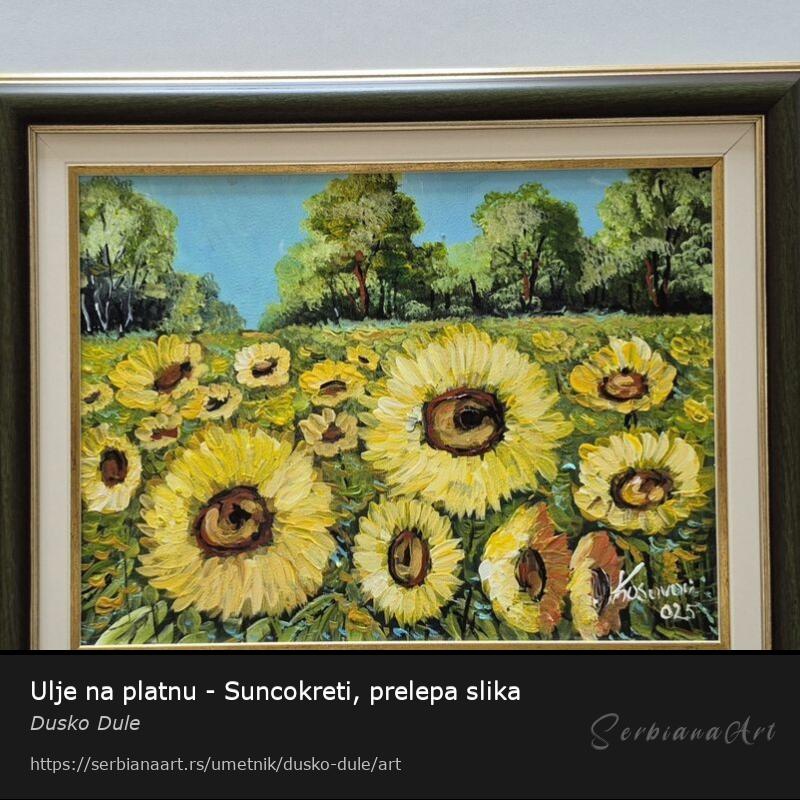 Ulje na platnu Suncokreti, prelepo umetnicko delo. Slika je uramljena u jako lep ram, dimenzije slike sa ramom 52 x 42. Privatna kolekcija.
