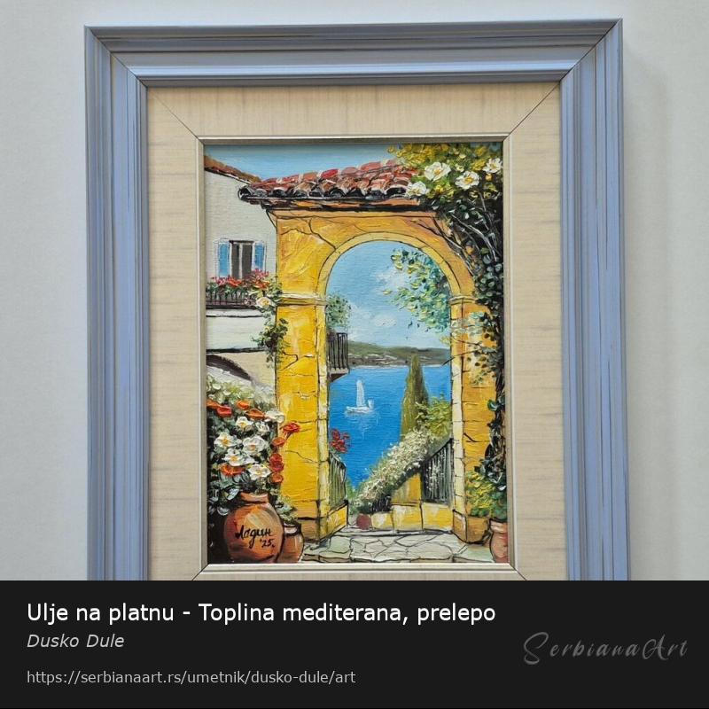 Ulje na platnu Toplina mediterana, prelepo umetnicko delo. Slika je uramljena u jako lep ram, dimenzije slike sa ramom 53 x 43. Privatna kolekcija.