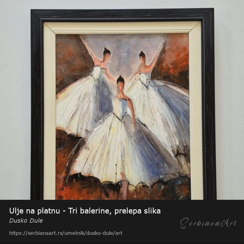 Ulje na platnu Tri balerine, prelepo umetnicko delo. Slika je uramljena u jako lep ram, dimenzije slike sa ramom 50 x 40. Privatna kolekcija.