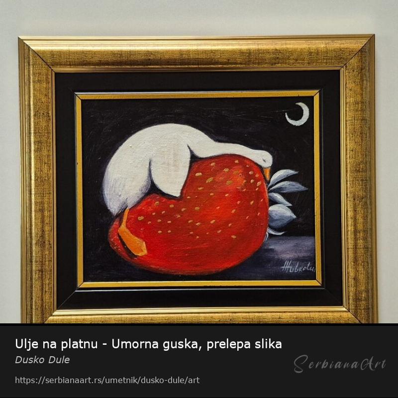 Ulje na platnu Umorna guska, prelepo umetnicko delo. Slika je uramljena u jako lep ram, dimenzije slike sa ramom 37 x 32. Privatna kolekcija.