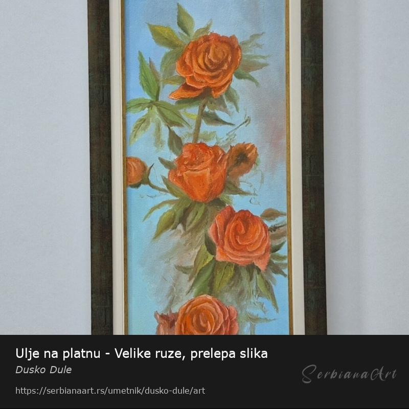 Ulje na platnu Velike ruze, prelepo umetnicko delo. Slika je uramljena u jako lep ram, dimenzije slike sa ramom 68 x 28. Privatna kolekcija.