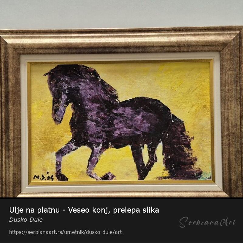 Ulje na platnu Veseo konj, prelepo umetnicko delo. Slika je uramljena u jako lep ram, dimenzije slike sa ramom 41 x 31. Privatna kolekcija.