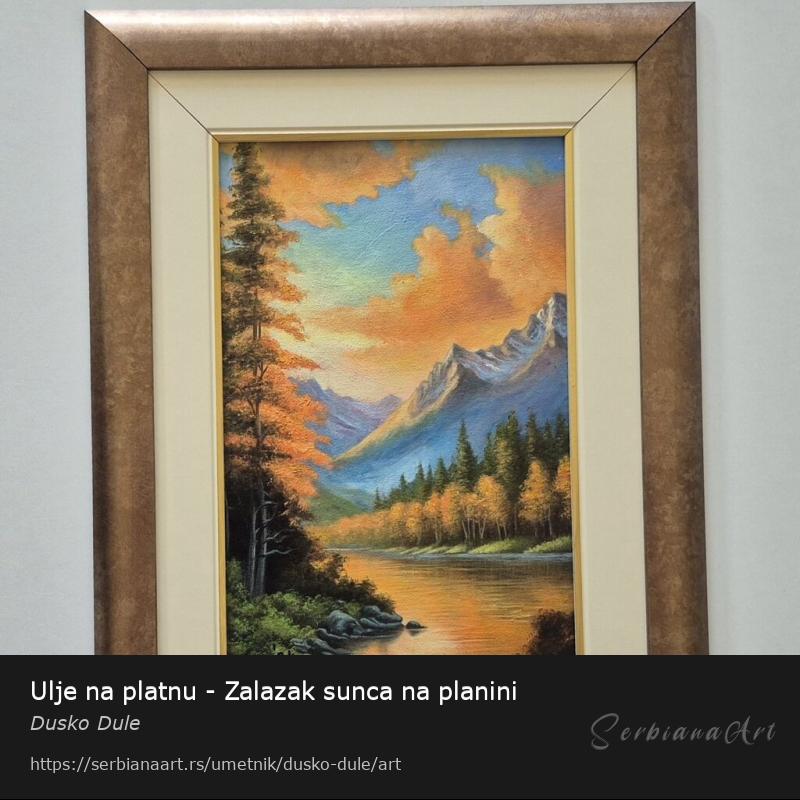 Ulje na platnu Zalazak sunca na planini, prelepo umetnicko delo. Slika je uramljena u jako lep ram, dimenzije slike sa ramom 44 x 34. Privatna kolekcija.
