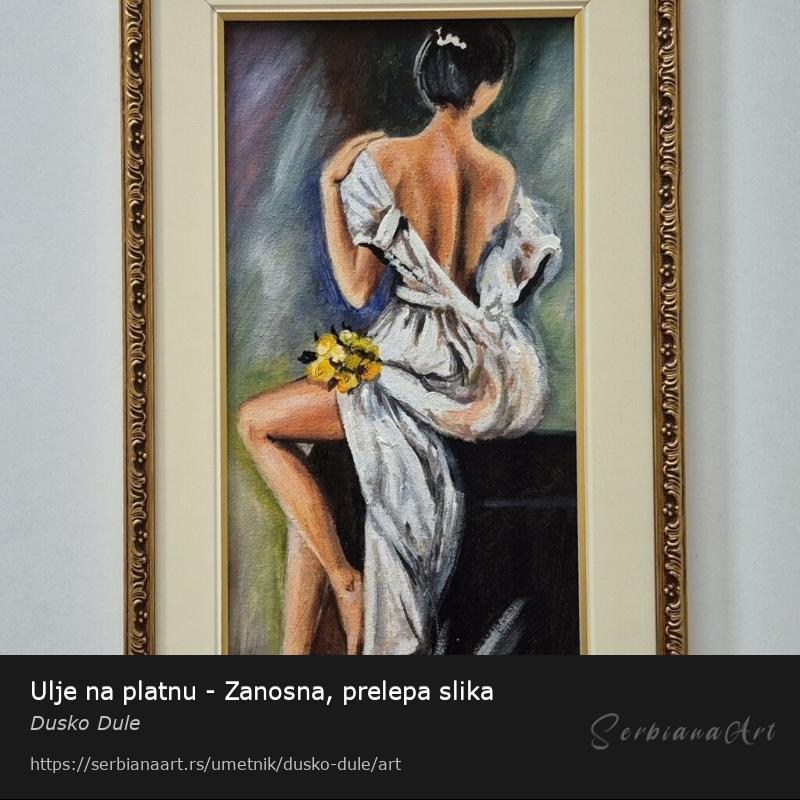 Ulje na platnu Zanosna, prelepo umetnicko delo. Slika je uramljena u jako lep ram, dimenzije slike sa ramom 44 x 29. Privatna kolekcija.