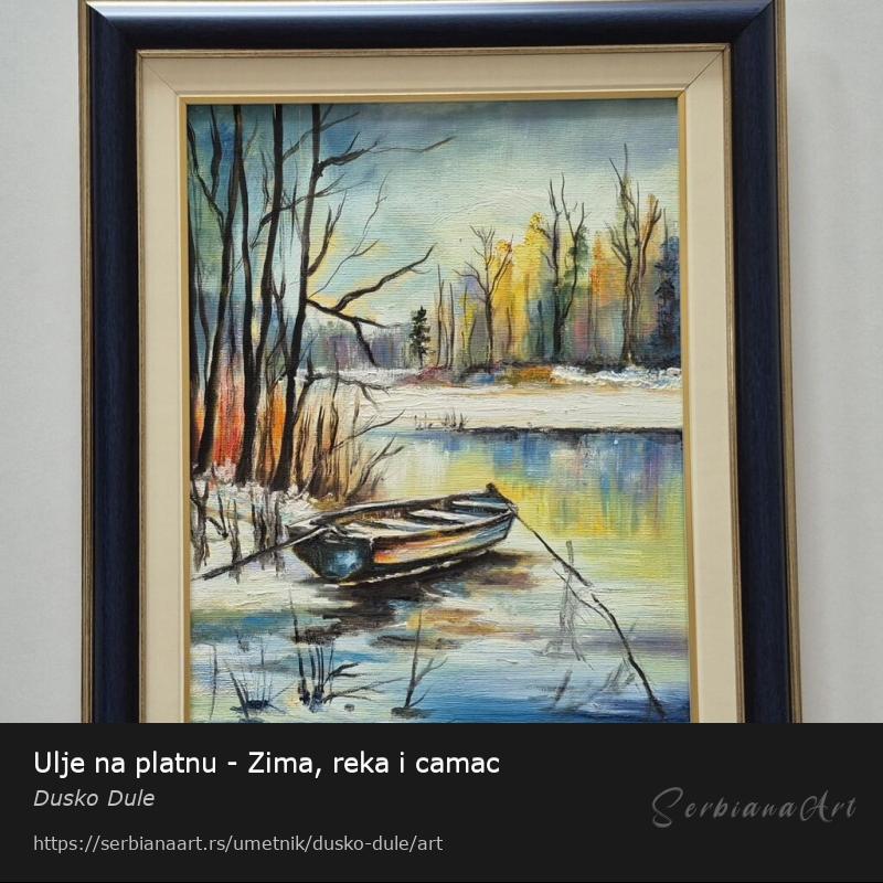 Ulje na platnu Zima, reka i camac. Prelepo umetnicko delo. Slika je uramljena u jako lep ram, dimenzije slike sa ramom 52 x 42. Privatna kolekcija.