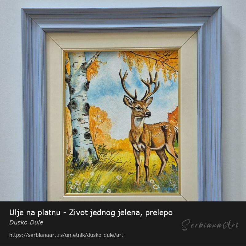 Ulje na platnu Zivot jednog jelena, prelepo umetnicko delo. Slika je uramljena u jako lep ram, dimenzije slike sa ramom 46 x 40. Privatna kolekcija.