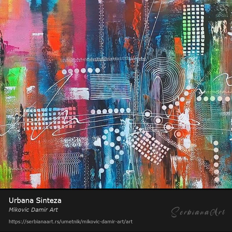 "Urbana Sinteza" je dinamična apstraktna slika koja kroz žive boje i slojevite detalje dočarava energiju i ritam savremenog grada. Koristeći kombinaciju ulja i akrila na platnu dimenzija 140x80 cm, umetnik stvara bogatu kompoziciju tekstura i oblika, gde se boje sudaraju i prelaze jedna u drugu, podsećajući na kontraste i pokrete u gradskom pejzažu. Bele linije i tačkasti uzorci naglašavaju sklad haotičnog, dok vibrantni tonovi dodaju osećaj životnosti i pokreta. Idealna je za moderne prostore, unoseći dašak urbane energije i dinamike.
